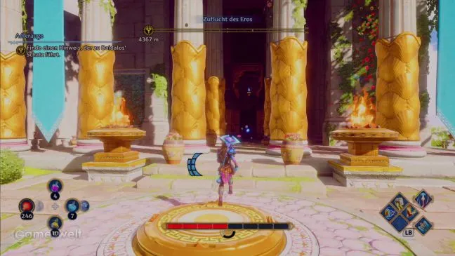 1) Большинство галактических драгоценных камней в этом задании по созвездиям легко найти, если посмотреть вокруг. Более сложные из них немного спрятаны. Например, в конце длинной дороги, ведущей к впадинам загадки созвездия, найдите тропинку, ведущую вниз по склону. На полпути к пляжу находятся несколько руин и (на первый взгляд) бесполезные энергетические барьеры. С одной стороны нужно раздвинуть осыпающуюся стену (или завалить ее камнем), на другом участке за энергетическим барьером вы найдете круглый напольный переключатель. Встаньте и на него. В результате энергетический барьер исчезнет прямо перед Вами, а между колоннами перед Вами появится еще один. Выстрелите стрелой Apollo через щели в колоннах в разрушающуюся стену, которую Вы снесли. Стрела попадет в цель. Теперь вы можете подобрать голубой мрамор и поднести его к гнездам.