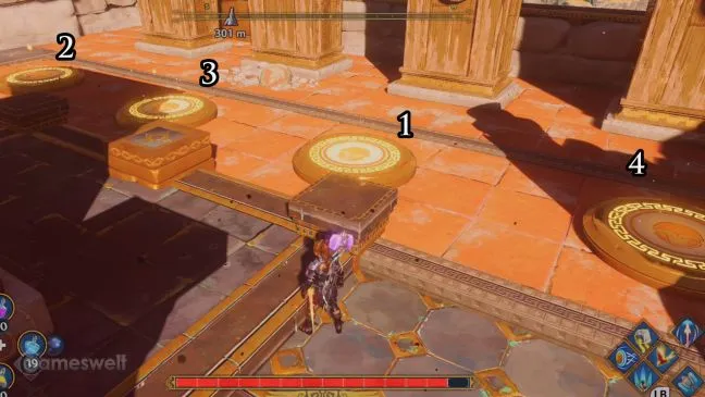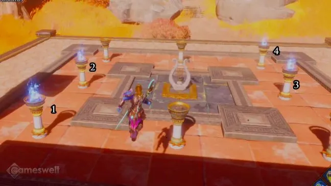 1) Маленькая лира: зажгите четыре факела в правильном порядке. Рисунок на одной из стен здания подсказывает, какие факелы являются правильными, но не порядок. Решение вы можете увидеть на нашем скриншоте. Затем послушайте, как перебираются струны маленькой лиры, и точно так же введите их стрелками на большой лире (последовательность струн слева направо: 311243).