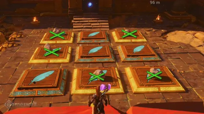 4) Маленькая Лира: Используйте рычаг, чтобы запустить временной лимит, материализовав все неактивные вспышки. Затем найдите удобную позицию, чтобы выпустить несколько стрел Аполлона. Стрелы должны пройти через огонь, а затем попасть в один факел за один раз, при этом множество статуй вокруг усложняют задачу. Очень полезно иметь возможность замедлять стрелы Аполлона с помощью божественной силы. Струны лиры расположены следующим образом (считая слева направо): 1323