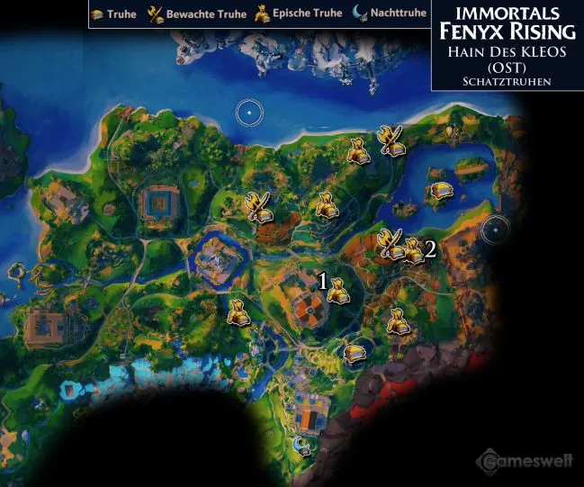 1) Эпический сундук. Грузы для окружающих ножных переключателей скрыты красным кристаллическим камнем. За одним из них нужно бежать вверх по лестнице, другой находится на том же уровне, что и сам сундук, который находится в небольшом здании.