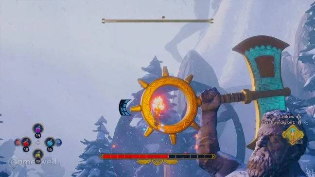 Точка B) - Задача Улисса у колеса огня Колесо огня находится слева от тропинки, но оно еще не горит. Вам нужно позаботиться о том, чтобы оно снова стало источником тепла. На небольшом холме справа от тропинки находится наземная плита, из которой нужно выстрелить стрелой Аполлона. Для этого выстрела не нужен костер, так как первая проушина, через которую вы стреляете, уже зажжена. Проушины проходят через всю площадь перед Вами и образуют большую дугу. Последняя станция Вашей стрелы - очаг возгорания прямо перед деревянным колесом (которое немного напоминает деревянное колесо обозрения с ярмарки).