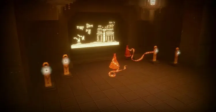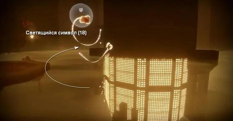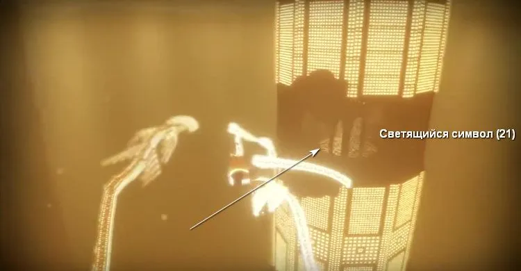 Теперь прыгаем по маленьким площадкам и заходим в саму башню, чтобы использовать светящийся символ (18). Как только мы оказываемся на одной площадке, вторая начинает загораться и мы понимаем, куда надо лететь потом. Таким образом мы оказываемся у следующей картины. Она также заполняется светом.