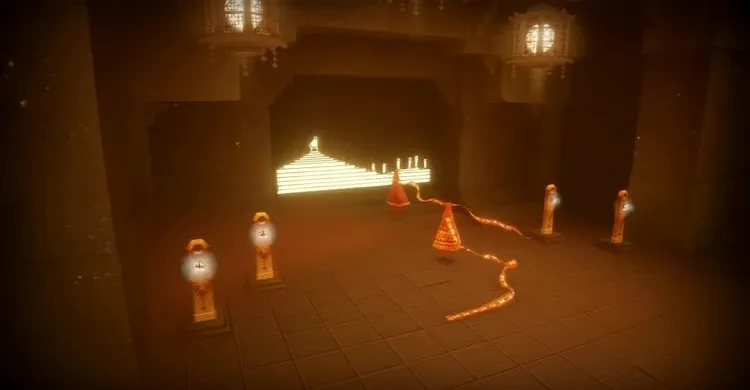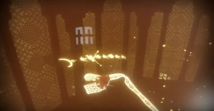 С правой стороны появляется световой шар и из него выныривает дракон из ткани. Летим к месту, откуда он выплыл. Нам нужно добраться до маленького прохода справа и попасть в круглое помещение с колоннами.