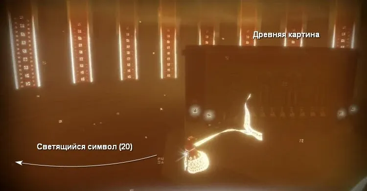 Внимательно осматриваем левые колонны и используем светящийся символ (20). Затем направляемся в центр и активируем древнюю картину [8].