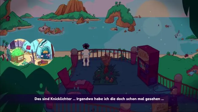 В третий раз используйте телескоп на смотровой площадке и теперь смотрите ТОЧНО НА НЕЕ: Прямо перед большим островом, который находится слева от кольца и за большим скелетом, из воды торчит заостренный камень. А сразу за ним слева должен появиться слабый объект с синей каймой. Как только вы нажмете на него, Ларри увидит, что это синяя лодка! Мы отметили это место на нашем рисунке красным кружком.
