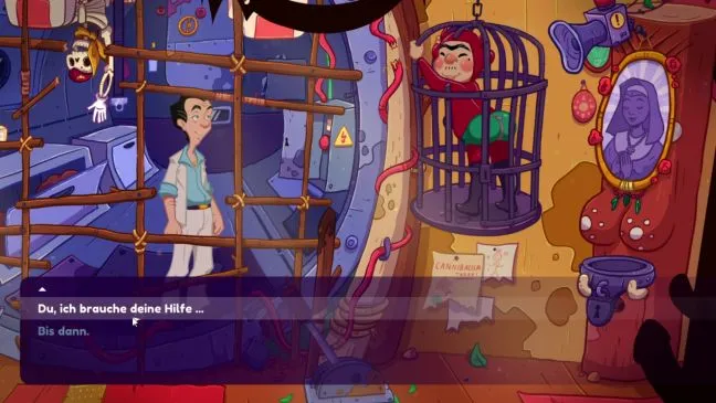 Одно место находится между коробкой и Свинглом. Вы можете поговорить с ним, но сейчас это не принесет никакой пользы. Поэтому обратите внимание на переключатель, который воткнут в пол перед дверью клетки и который можно передвинуть с помощью руки скелета. После этого клетка Свингла поднимется так, что он сможет достать рукой до щели в тросе.