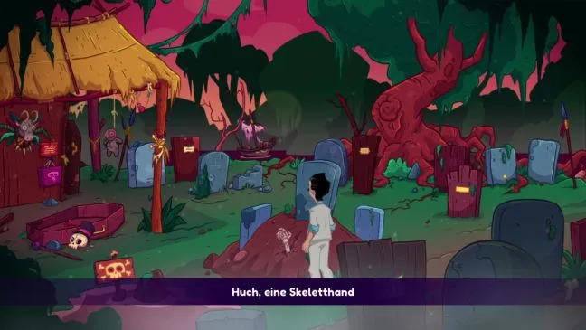 У вас уже есть один из необходимых предметов для сумки вуду: мелкая приправа, а точнее, соль и перец, которые вы только что подобрали рядом с котелком. Также посмотрите на видную могилу в центре, где покоится Матрона Фригида. Можно поковыряться в рыхлой земле и отломить скелетный палец от появившейся скелетной руки.