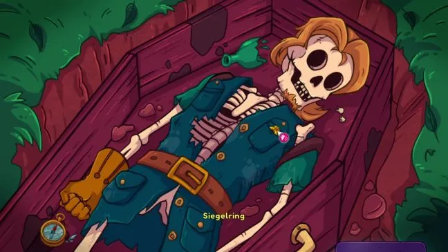 Далее отправляйтесь на кладбище за деревней каннибалов и осмотрите все могилы. На могильном камне в самом конце слева написан девиз Кокборна, который вы узнали от Бобби Марли. Важно: Ларри сам должен заметить, что изречения идентичны! Если это не так, то вы либо не поговорили с Бобби, либо не рассмотрели надгробие должным образом.