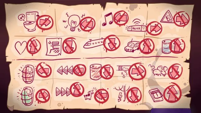 На бумаге изображены двадцать символов, каждый из которых перечеркнут стрелкой. Это говорит о том, в каком направлении двигаться НЕЛЬЗЯ! Кроме того, некоторые знаки являются визуальными, а некоторые - акустическими. В первом случае они висят на потолке, прикреплены к стене или лежат на полу. В последнем случае вы услышите шум один раз, вскоре после того, как войдете в новое помещение.
