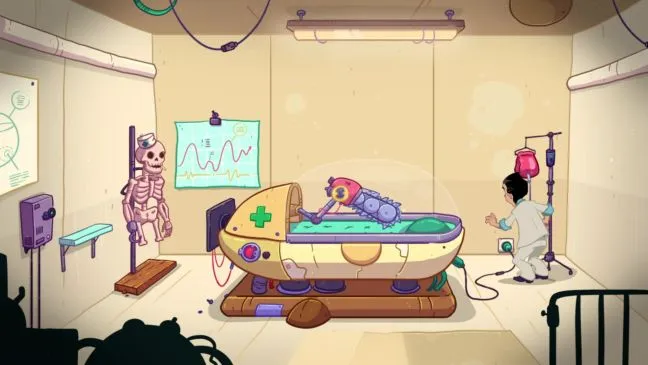 В комнате Med-O-Tron сначала вставьте образец пипи в крайнем левом углу, а скелетные тельца - в правом. Если вы хотите использовать Med-O-Tron, то сначала подключите его к розетке, расположенной сзади справа. Затем перейдите к панели управления Med-O-Tron и немного поиграйте с ней.