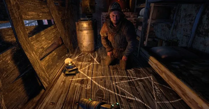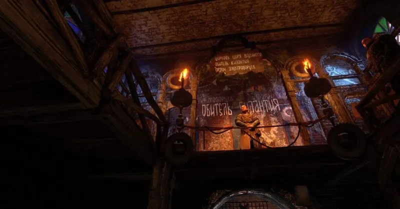 В конце канала, как только вы пересечете определенную границу, вас арестуют фанатики. Покиньте лодку и поднимитесь по деревянной лестнице наверх. Когда вы доберетесь до верхнего этажа, взаимодействуйте с красной дверью, и пусть женщина за ней расскажет вам кое-что об этом месте. Она откроет окно и позволит вам сбежать. Просто взаимодействуйте с оконной рамой, и Артём пролезет внутрь.