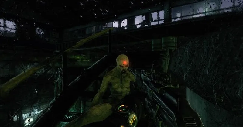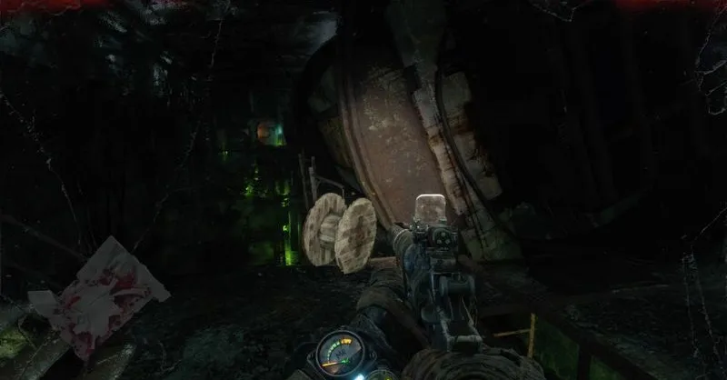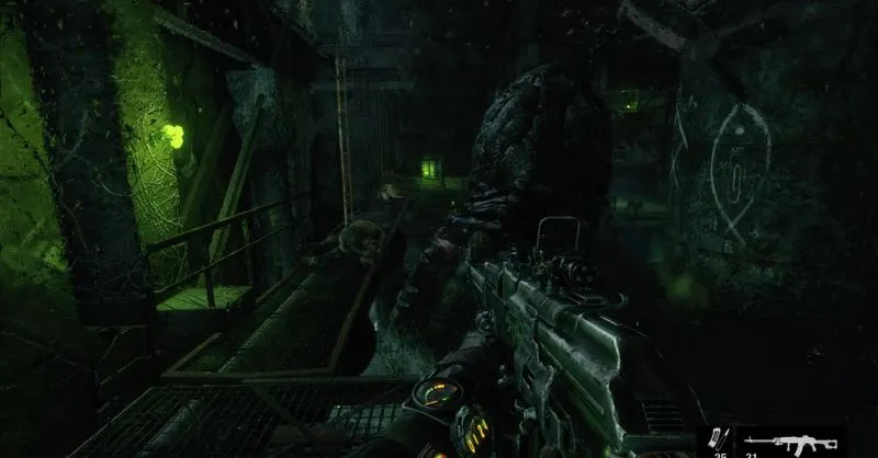 Идите по тропинке на север, разграбьте труп на другой стороне, а затем продолжите путь по решетчатой дорожке. Прежде чем вы достигнете следующей лестницы, появится враг. Выстрелите ему в голову, а затем возьмите несколько улучшений оружия с трупа, на котором он появился. Затем продолжайте подниматься по только что упомянутой лестнице. Перейдите мост как можно дальше и ждите, пока сом не нападет. Артём приземляется в воду, но тут же может спастись на суше.