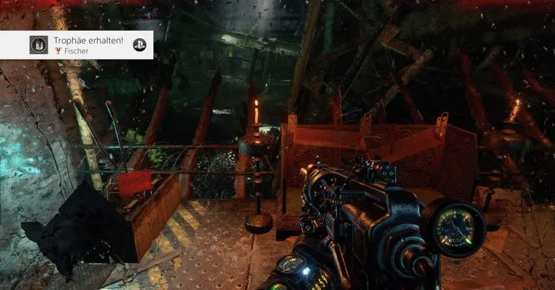 Когда вы доберетесь до больших красных ворот, взаимодействуйте с колесом рядом с ними, чтобы открыть их, а затем бегите в комнату прямо рядом с ними. Здесь вы найдете, среди прочего, коллекционную «Толстую фондовую книгу». В этой комнате также есть три устройства: колокольчик, с помощью которого можно вызвать сома. Три веревки, соединенные с тремя трупами, с помощью которых вы можете кормить сома, чтобы он сохранял позицию прямо перед вами. И устройство для сбрасывания мусора с потолка в воду. Если вы хотите получить трофей – достижение «Рыбак», вы должны использовать эти устройства.