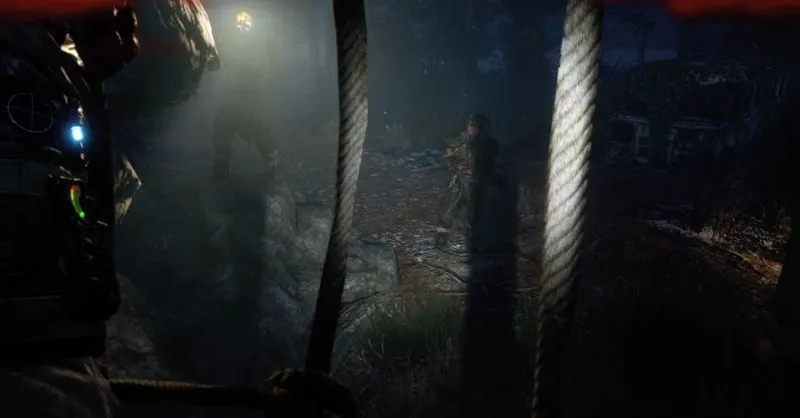 Здесь вы найдете веревочную лестницу, которая поможет вам взобраться на скальную стену. Вся территория освещена факелами, поэтому найти его не составит труда. Поднимитесь наверх, пройдите по тропинке и скатитесь вниз с другой стороны. Через несколько метров Артём попадёт в ловушку, и пока что вы можете только следить за развитием событий.