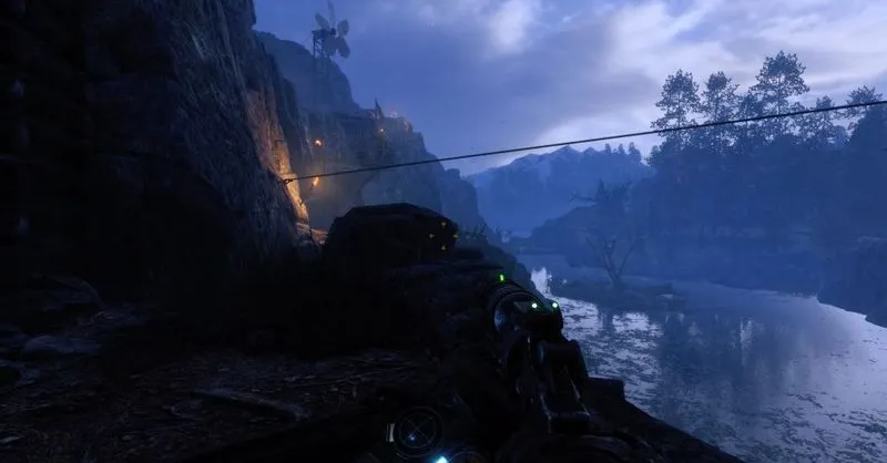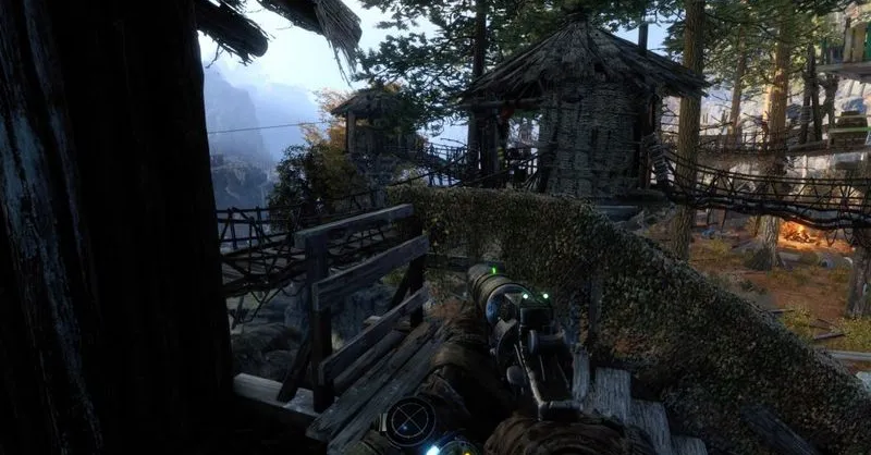 После того, как Артём был пойман и спасён мутировавшим медведем, настало время искать Алёшу. Местные жители схватили его и сейчас обсуждают, следует ли его казнить как чужака. Конечно, вам есть что сказать по этому поводу. Подберите оружие и снаряжение мертвеца, а затем отправляйтесь исследовать местность. Однако если вы просто хотите продолжить путь, поднимитесь по близлежащей веревочной лестнице, перейдите по мосту через домик на дереве и используйте веревочную горку, чтобы добраться до близлежащего оврага. Там вы забираете рюкзак у раненого и можете, наконец, восстановить себя.