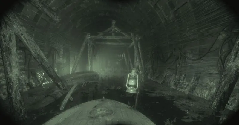 Добравшись до лодки у причала, садитесь в нее и гребите вдоль прохода. На следующем причале снова выйдите и войдите в темные комнаты. Здесь хорошо бы использовать прибор ночного видения. Просто следуйте по коридорам, но остерегайтесь плюющихся червеобразных существ, висящих на стенах и нападающих на Артёма издалека. Теперь бегите в последнюю комнату слева и отбейтесь от нападающего мутанта.