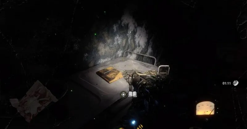 После того как вы вместе с Миллером доберетесь до станции метро и откроете большие ворота, вы пройдете через длинный туннель обслуживания в зону, где полковник попросит вас поискать полезные вещи. Здесь, на столе, лежит эта записка, готовая к приему.