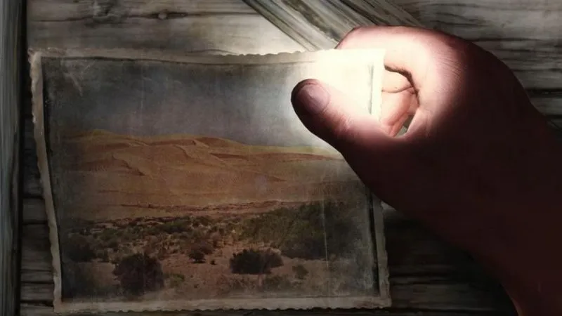 Обыщите лагерь бандитов на отмеченной позиции. Напротив ряда домов находится одинокая хижина, слегка приподнятая над землей. Поднимитесь по ступенькам и войдите в здание. Открытка, которую вы ищете, висит на стене рядом с дверью во второй комнате.