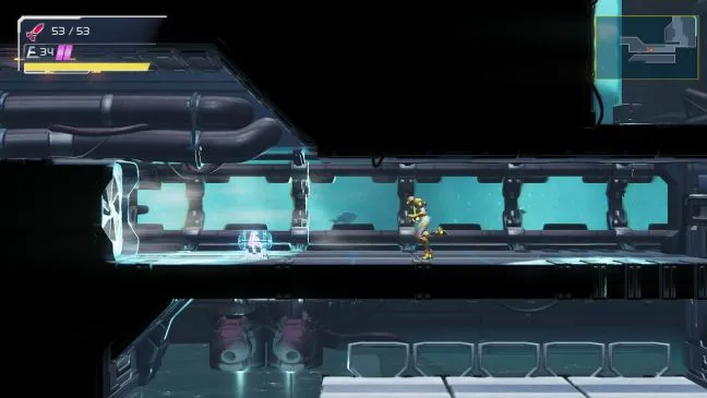 Спустившись ниже, вы сможете заблаговременно получить следующий [Missile+ Container]. Как только вы снова окажетесь в воде и увидите [Grapple Beam Block], не прыгайте вниз в очень большую зону. Посмотрите на карту, и вы увидите это место. Опуститесь в бассейн и сразу же наклоните левый стик влево. Это должно безошибочно привести вас на платформу с предметом. Если вы пропустите его, вернитесь позже с помощью [Винтовой атаки].