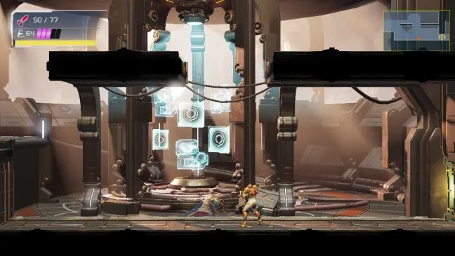 С помощью [Grapple Beam] поднимайтесь вверх, пока не достигнете зоны E.M.M.I. в Ферении. По пути вы увидите в шахте [Energy Unit], но без [Screw Attack] до него не добраться. К счастью, с фиолетовым E.M.M.I. вам пока не придется иметь дело, так как Chozo Quiet Robe деактивирует его. Насладитесь длинной сценой и приготовьтесь к схватке с мини-боссом. В дальнейшем вы еще несколько раз столкнетесь с подобными роботами Chozo. Процедура всегда одна и та же.