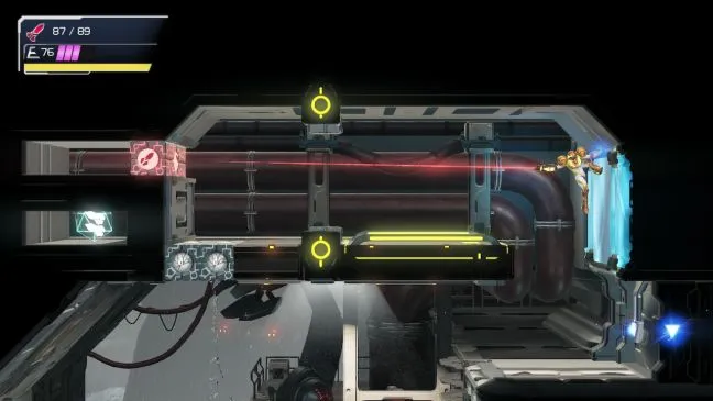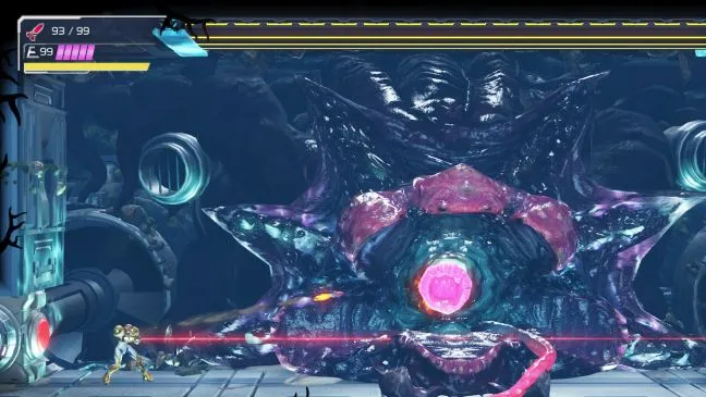 Теперь с помощью [Grapple Beam] подтянитесь к магнитной поверхности на потолке, которая перебросит Вас через Дрогигу на другую сторону комнаты. Там нужно быстро повторить процесс с помощью [Second Switch], чтобы полностью слить воду. Теперь монстр покажет свое слабое место. Выпустите несколько ракет по розовой части тела и вовремя подпрыгните, чтобы избежать удара тонкого щупальца. Вы также можете [Counter], чтобы запустить еще одну эффектную последовательность.
