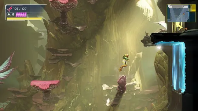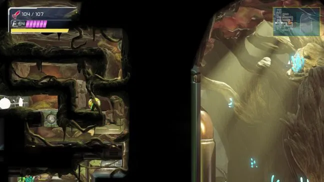 Пребывание здесь непродолжительно. После короткой системы шахт вы попадаете в [Map Terminal], где можно загрузить карту Гаворана. Прямо напротив, к сожалению, находится прямой путь обратно в E.M.M.I., но сначала нужно уничтожить скрытый [Bomb Block]. Перемахните через угол на другой конец, пройдите по тропинке, выйдите из зоны и снова войдите в нее чуть выше. Пройдите прямо через зону E.M.M.I. и снова выйдите на открытое пространство. Вы окажетесь в очень просторной зоне с быстро уменьшающимися листьями, которые можно использовать в качестве платформ. Выйдите из зоны в центре справа, уничтожив [Plasma Beam Armour].