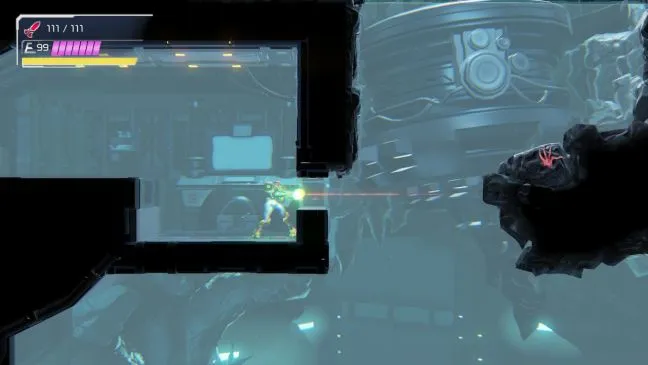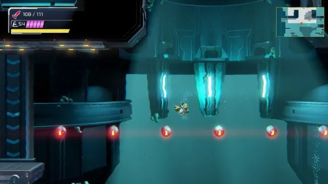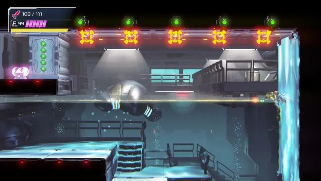 В Бурении вы можете пока пройти только налево и вернуться в комнату с очень большим бассейном. В центре воды вы заметите линию светящихся сфер. Встаньте прямо перед шлюзом в правой части комнаты. Если вы еще не опустили магнитную платформу напротив, используя [Grapple Beam], то сделайте это в первую очередь. Из шлюза с помощью [Space Jump] прыгните по прямой к шлюзу на другой стороне.