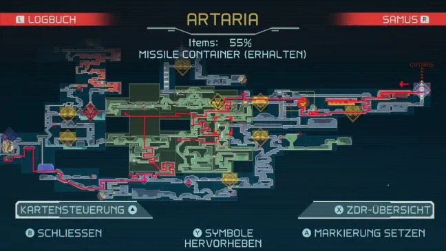От [Lift] Cataris идите не вниз, а налево. Повисните на магнитной дорожке на потолке и в нужный момент упадите. Первый [Контейнер с ракетами] ваш. Продолжайте идти налево в следующий горячий туннель. Там вам нужно только добраться до другого конца, чтобы получить второй [Missile Container]. Через [Станцию хранения] пройдите к неактивному [Терминалу]. Заложите [Бомбу] в углубление в стене, затем выстрелите [Ракетой] вслед за ней и возьмите следующий [Контейнер с ракетами] в камере за ним. Теперь поднимитесь к [Сетевой станции], которую вы покинули в левом верхнем углу. В короткой шахте находится еще один контейнер [Missile Container]. Оттуда идите в центр зоны E.M.M.I. Там с помощью [Grapple Beam] можно снова поднять бывший люк и получить еще один [Missile Container].