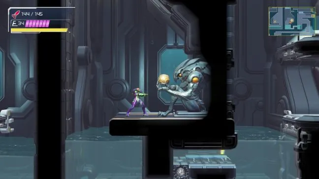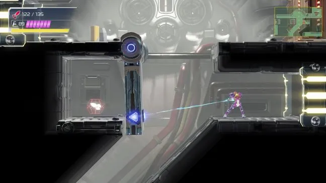 Теперь пройдите в длинный коридор прямо над этим предметом. На правой стене вы увидите [Скрытый блок]. Подбегите к нему с помощью [Speed Booster], приготовьте [Shinespark], уничтожьте его, протиснитесь в щель, а затем выстрелите [Shinespark] влево. Вас выбросит через гигантский зал в секретную шахту с еще одним [Missile Container]. Выходите из зоны E.M.M.I. внизу через наклонную шахту. На станции [Energy Loading Station] над левым бассейном находится еще один [Missile Container]. Идите по тропинке налево и пересеките комнату, где вы победили [Солдата Чозо]. В зоне слева вы легко подберете еще один [Контейнер с ракетами] наверху.