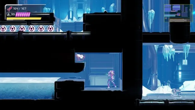 Теперь продолжайте движение по тропинке в комнату, расположенную прямо над ним. Держитесь за щель в стене и попадите по всем переключателям с помощью [Storm Missile]. Теперь вернемся в царство фиолетового E.M.M.I. Вы увидите, что теперь, когда у вас есть [Gravity Suit] и [Screw Attack], он стал совсем беззубым. Оставайтесь на вершине. Напротив фиолетового [Wave Beam Armour] уничтожьте [Red Blobs], чтобы в конце концов добраться до следующего центрального блока.