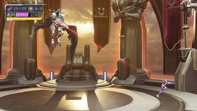 За лазерным прицелом может последовать и другая атака: Сильная атака под косым углом вниз с довольно коротким радиусом действия. Raven Beak будет двигаться перед ним немного статичнее, чтобы вы могли различать эти две атаки. В остальном вам нужно следить только за его таранными атаками. От горизонтальных атак можно уклониться с помощью Screw Attack, от вертикальных - с помощью бега. В промежутках, конечно, нужно стрелять изо всех сил! Наконец, босс теряет крылья, и вы вступаете в последнюю фазу.