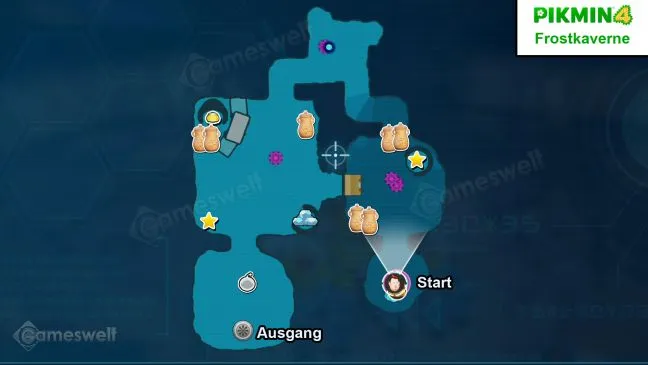 Как и во всех пещерах, в Морозной пещере нет доступа к цветам. Это означает, что вы должны заботиться о своих пикминах, чтобы не потерять их. Они не должны погибнуть при вас, иначе игра закончится преждевременно. В этой первой пещере вам не о чем беспокоиться, но вы должны знать о ней.