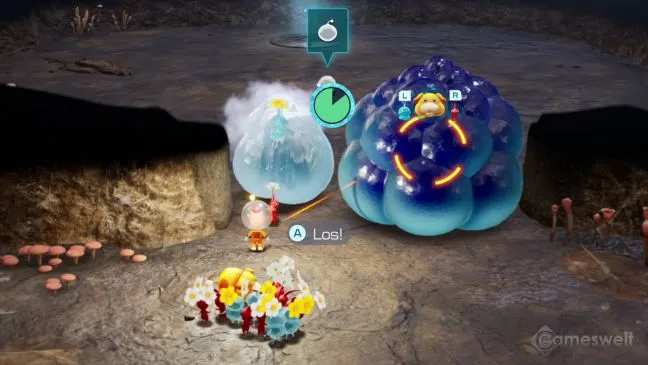Итак, теперь у вас есть куча красных Пикминов и четыре ледяных Пикмина. Вы можете отправить их по отдельности. Нажмите кнопку ZR или ZL, чтобы переключиться между красным и ледяным Пикмином. Затем используйте кнопку A, чтобы бросить только что выбранного пикмина.