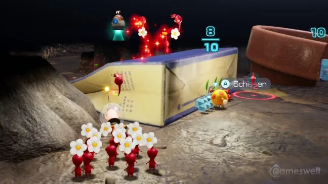 Прямо рядом с ним вы найдете компас (указатель судьбы) в разбитом цветочном горшке. Подбросьте своих пикминов к компасу, чтобы они подняли его и унесли. Но будьте осторожны: если вы еще не уничтожили упомянутых ранее жуков, то во время транспортировки они будут беспокоить и травмировать ваших пикминов. Поэтому лучше сначала избавиться от них.