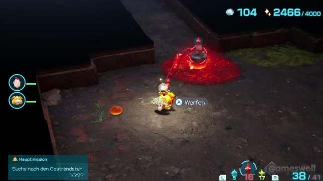 В небольшом тупике достаньте желтого пикмина, застрявшего в земле. Затем идите на север к следующим лавовым цилиндрам и раскаленному брикету. Здесь вы сможете добраться до цели только с помощью красных пикминов. Используйте желтого Пикмина, чтобы собрать сокровища на платформе (печенье и кольцо). Установите свою базу у каменного круга рядом с ним, чтобы вашим маленьким помощникам не приходилось далеко ходить.