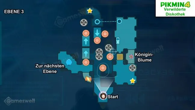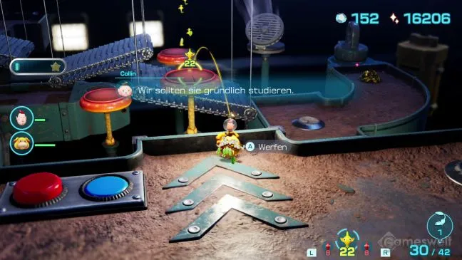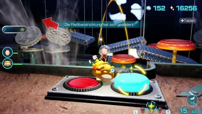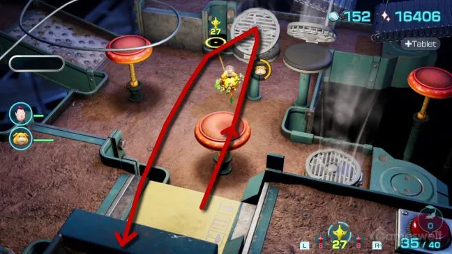 С самого начала бегите прямо вперед и ищите справа от платформы, похожей на гриб, вентилятор, который будет поднимать Вас вверх. Там, где вы окажетесь, вы найдете устройство с двумя кнопками (одна красная, другая синяя). Оставьте эти кнопки в покое и сначала осмотритесь. На краю платформы вы найдете место со стрелками, указывающими в одном направлении. Если бросить желтых пикминов в этом направлении на платформу, похожую на гриб, то они будут сброшены с этого грибного батута на конвейерную ленту, расположенную за ним, но они не смогут убежать, поскольку их всегда перебрасывают с одной стороны на другую.