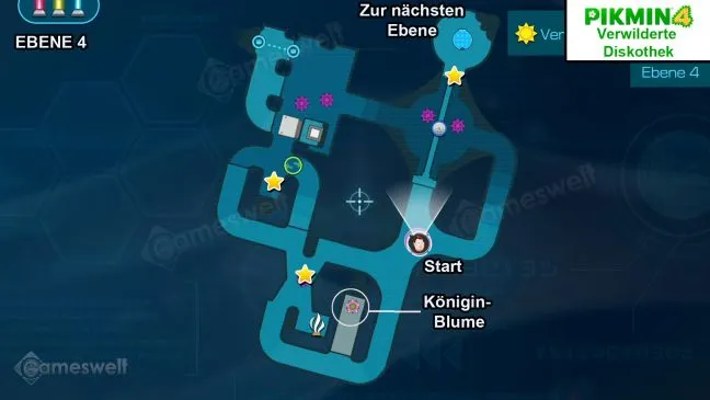 Четвертый уровень также выглядит сложнее, чем на самом деле. Сначала бегите на юг и уничтожьте все пузыри. Генераторы (эти отверстия стреляют пузырями, в которых могут застрять ваши Пикмины). Бросайте больше пикминов в пузыри, в которых застряли ваши пикмины, чтобы освободить их).