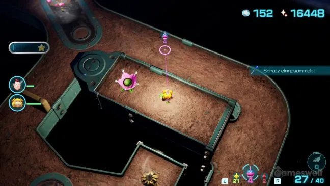 Прежде всего, необходимо раскопать отверстие справа от точки падения. Это проход к другому отверстию рядом с конвейерными лентами. Это приведет вас к куче золота. Теперь посмотрите, где на конвейерной ленте стоят другие пикмины. Подождите, пока они дойдут до конвейера слева, а затем заберитесь на красную кнопку. Это изменит направление движения всех конвейеров. Если ваши Pikmin стоят правильно, они приземлятся в новой области слева от конвейеров.