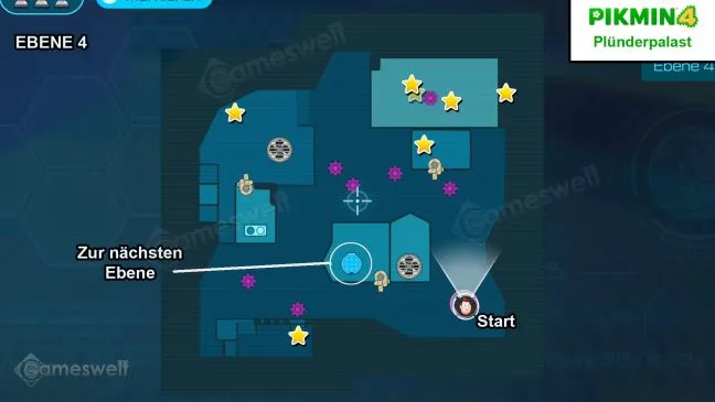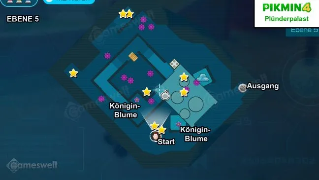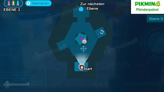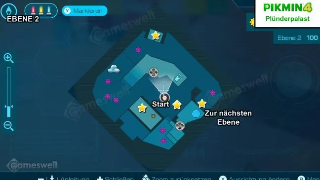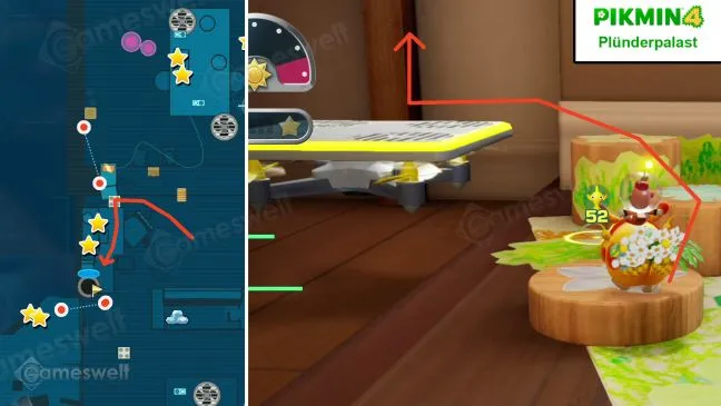 Чтобы перейти на второй уровень, вам нужны каменные Pikmin, иначе стеклянные барьеры не позволят вам попасть в важные зоны. Вы найдете несколько бутонов в земле, если пройдете по единственному возможному пути (вверх по рампе) и подниметесь на уровень выше с помощью вентилятора. Если вы посетите этот уровень во второй или третий раз, то обнаружите на этом месте королевский цветок. Прямо рядом с ним вы найдете первое сокровище - пару картонных 3D-очков (конвертер измерений).