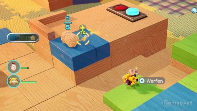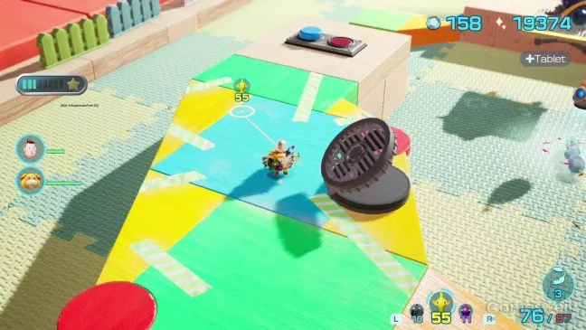 Теперь слезьте с Очина и покиньте эту платформу, не забирая с собой пикминов (именно по этой причине их следует бросить). Перебегите на первую платформу и поднимитесь к переключателю вентилятора с помощью своего маленького космонавта. Активируйте его. Теперь переключитесь на Ошина и позвольте ему и его Пикмину (которого можно вызвать свистком на его спине) катапультироваться на стол с помощью теперь уже включенного второго вентилятора. Там Ошин прикажет Пикмину забрать фишки с собой - и вы уже разгадали маленькую головоломку.