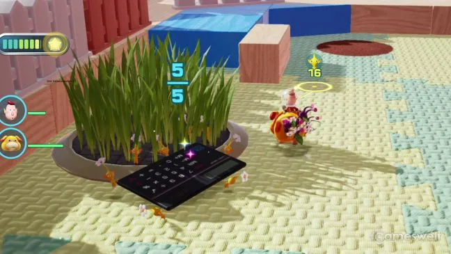 Поэтому нужно как можно скорее получить фиолетовых пикминов от двух цветов-королевичей, которые выиграют перетягивание каната и победят врагов. Помогите им в бою, используя таранную атаку Очина.