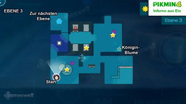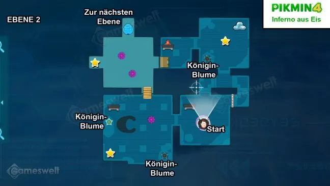 Бегите на запад, сначала сразитесь с врагами и используйте цветок королевы, чтобы получить пять пикминов черного камня. >За трубой вы найдете второй цветок королевы, который даст вам пять ледяных пикминов. Затем постройте из сырья глиняный пандус, чтобы попасть в северо-западную комнату.