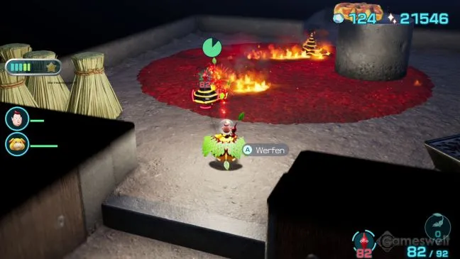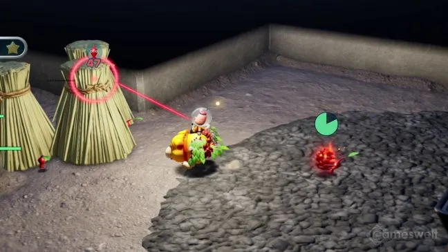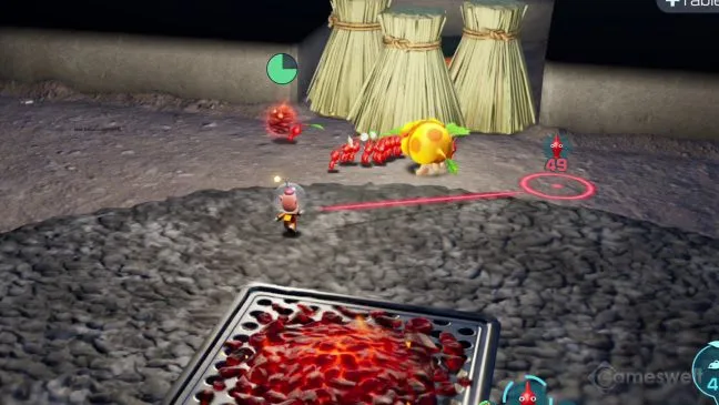 Когда вы уничтожите всех огненных врагов в этой комнате, вы подойдете к угольному камину с первой горящей сосновой шишкой. Возьмите ее красным пикмином и используйте, чтобы поджечь пучки соломы, стоящие на Вашем пути. Достаточно выбрать одного Pikmin'а, несущего сосновую шишку (переключайтесь на него с помощью L и R), и бросить его в пучки.