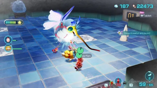 В соседней комнате вы найдете еще одну подобную зону. Остерегайтесь бронированного летающего врага - его можно ранить только за открытую спину. Если он разинет рот, то высосет у вас пикмина.