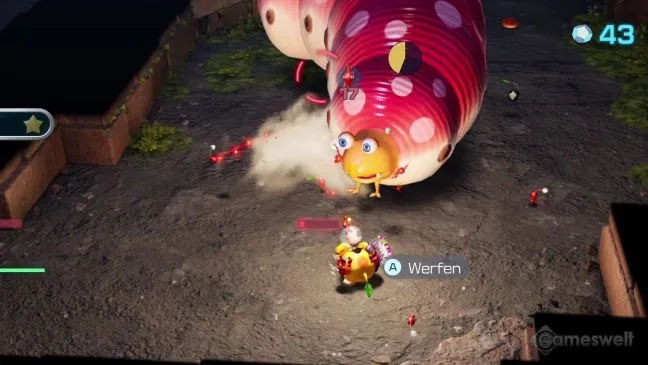 В качестве альтернативы можно попытаться бросить ей в голову фиолетового и красного Пикмина, но имейте в виду, что она может стряхнуть с себя ваших маленьких помощников, а затем просто перекатиться через них. Поэтому нужно быстро реагировать, если ваш Pikmin приземлится на землю.