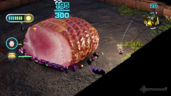Дальше все как обычно: постройте из сырья рампу, которая приведет вас к шипастому монстру. С этим чудовищем нужно работать в основном каменными пикминами, чтобы потерять как можно меньше пикминов. Побежденный монстр даст вам огромный блок ветчины (King of Hams), для получения которого вам потребуется сила 300 пикминов. Поскольку у вас с собой может быть не более 100 пикминов, вам понадобится сила фиолетового пикмина. Кроме того, вы можете приказать Очину помочь вам (при условии, что в базовом лагере вы дали ему необходимые обновления энергии). Находящийся поблизости цветок королевы усилит ваш отряд.