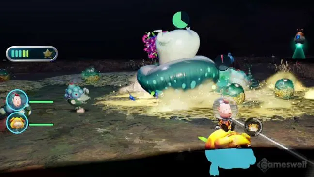 Снова "Королевский луковичный глаз"? Да, но на этот раз на мягкой земле. Каждый раз, когда он прыгает, он прорывает дыру в земле, которая заполняется водой. Поскольку вы не хотите, чтобы ваши пикмины утонули, вам придется закончить бой быстрее. В противном случае придерживайтесь нашей стратегии боя, описанной далее (уровень 5).