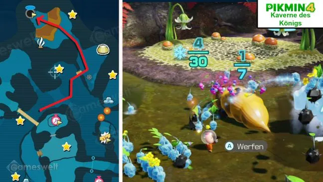 Пещера короля - это чистый парад боссов с 20 этажами. Здесь вы найдете последние сокровища, отсутствующие в вашей коллекции, но искать их особо не придется. Они даются за победу над боссами. Так что все дело в боях, и вам следует подготовиться соответствующим образом. Вам понадобится много фиолетовых пикминов, много каменных пикминов, много ледяных пикминов и несколько водных пикминов. Всех сразу, конечно, не возьмешь, и пройти эту пещеру целым и невредимым будет очень трудно (хотя и не невозможно). Вы потеряете много пикминов и будете вынуждены вернуться на поверхность, чтобы создать новых пикминов.