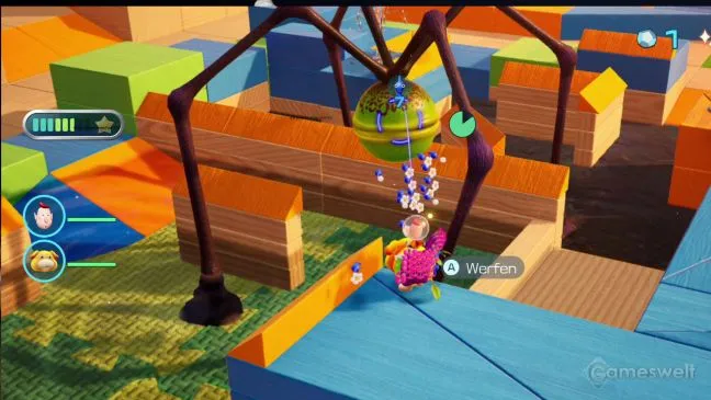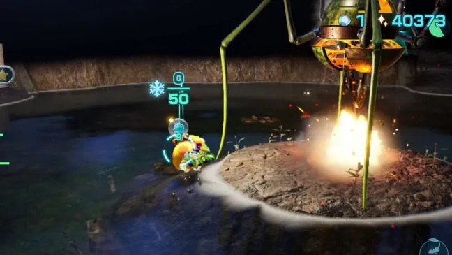 Большой паук с пулеметом вернулся. Он и так был напряженным в обычной обстановке, но теперь он оказался на крошечном островке, окруженном водой, поэтому нужно еще плотнее обвести его вокруг пальца, чтобы можно было бежать без особого замедления. Также следует использовать синих водных пикминов, которые не утонут, если их стряхнуть со среднего шара.