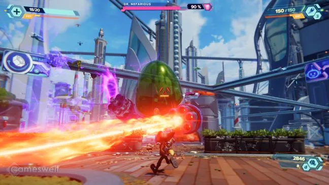 Противный Доктор Нефариус веселится от души. У него есть Габаритомер, который поврежден, но все еще в какой-то степени работает. Единственное, что его раздражает, - это то, что Рэтчет и Кланк обошли его головорезов. Теперь он хочет это изменить. Сидя в своем космическом корабле, он стреляет в вас толстым лазерным лучом. Избежать этого луча можно, дважды перепрыгнув через него. Для этого нужно хорошо рассчитать время. Если это не удается, прячьтесь за стенами. Они защитят Вас от его лазера (если он не атакует под определенным углом). Но они не защитят Вас от ракет, которые он время от времени выпускает.